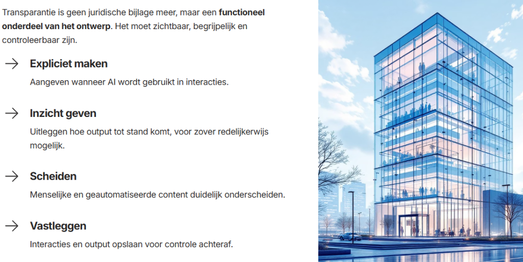 Wat opvalt is dat transparantie niet langer een juridische bijlage is, maar een functioneel onderdeel van het ontwerp. Het moet zichtbaar, begrijpelijk en controleerbaar zijn.