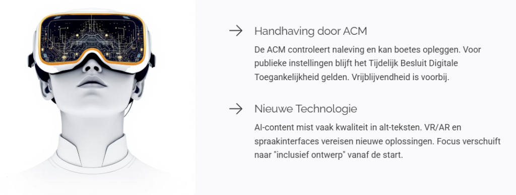 Voor publieke instellingen blijft daarnaast de bestaande toegankelijkheidsverplichting uit het Tijdelijk Besluit Digitale Toegankelijkheid recht overeind, inclusief het publiceren van toegankelijkheidsverklaringen. Dat onderscheid is belangrijk: sommige organisaties vallen onder beide kaders.