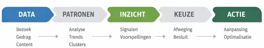 Het gaat dan niet om gemiddelden, maar om variatie. Welke routes nemen bezoekers daadwerkelijk door de site, los van het bedoelde pad. Waar ontstaat frictie, en bij welk type gebruiker. Welke content wordt geopend, maar zelden uitgelezen.