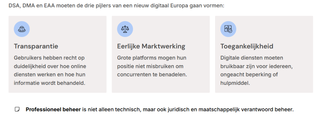 Voor websitebeheerders en digitale dienstverleners ontstaat zo één rode draad: professioneel beheer is niet alleen technisch, maar ook juridisch en maatschappelijk verantwoord beheer.