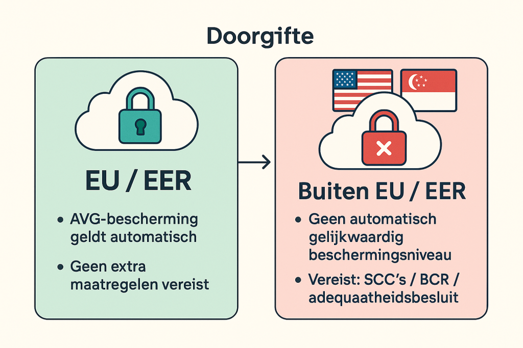 Let extra op wanneer persoonsgegevens buiten de EU/EER worden verwerkt of opgeslagen. Veel cloudservices (zoals Amerikaanse platforms) vallen hieronder. Sinds het wegvallen van Privacy Shield in 2020 zijn er striktere eisen: je moet kunnen aantonen dat gegevens buiten Europa een vergelijkbaar beschermingsniveau krijgen. Dit doe je via standaard contractbepalingen (SCC’s), bindende bedrijfsregels of een adequaatheidsbesluit van de Europese Commissie. Controleer bij je leveranciers waar data fysiek wordt opgeslagen en welke waarborgen zijn getroffen.