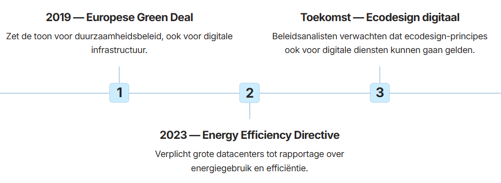 Er bestaat op dit moment geen specifieke Europese wet die websites verplicht om energiezuinig te zijn. Toch beweegt regelgeving langzaam in die richting. Een aantal ontwikkelingen is relevant.