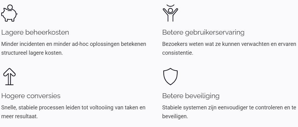 Innovatie is aantrekkelijk, maar zonder stabiliteit levert het zelden iets op. Een snelle ontwikkeling van nieuwe functies kan op korte termijn een voordeel lijken, maar op lange termijn leidt het tot meer beheerlast en een grotere kans op incidenten. De organisaties die het meest profiteren van hun website zijn juist de organisaties die investeren in rust, ritme en onderhoud.
