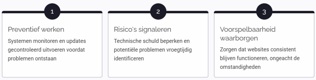 Ons werk draait voor een groot deel om het voorkomen van problemen. Door systemen te monitoren, updates gecontroleerd uit te voeren, risico’s te signaleren en technische schuld te beperken, zorgen we ervoor dat websites voorspelbaar blijven functioneren. Die voorspelbaarheid is voor veel organisaties belangrijker dan welke nieuwe functie dan ook. Het is de basis waarop groei, innovatie en betrouwbaarheid rusten.