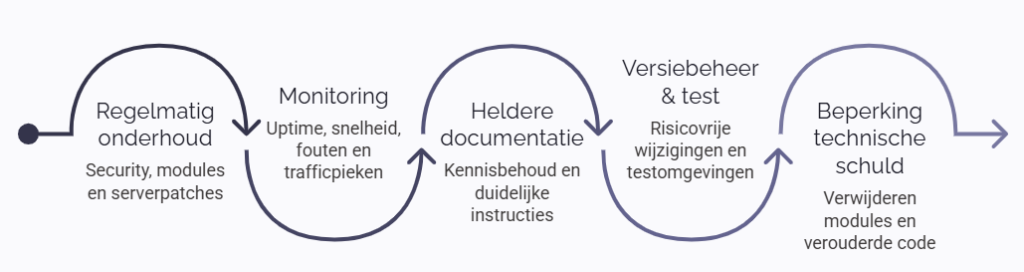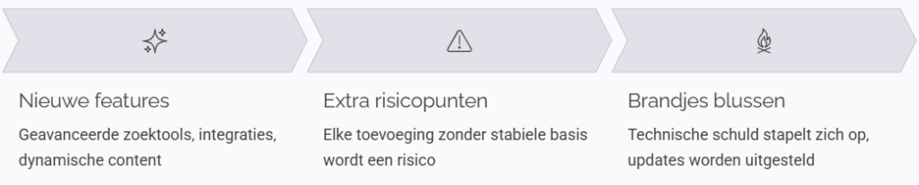 In onze praktijk zien we dit vaak terug, juist omdat veel organisaties na oplevering geen structureel onderhouds- en updateproces inrichten en ervan uitgaan dat de website zichzelf wel blijft dragen. Nieuwe features worden opgeleverd, iedereen is tevreden, maar na een paar maanden stapelt de technische schuld zich op. Updates worden uitgesteld, configuraties verouderen en gebruikersrapportages nemen toe. Het gevolg: een organisatie die steeds meer tijd kwijt is aan het brandjes blussen, in plaats van aan verbeteringen die echt waarde toevoegen. De website wordt langzaam een risicofactor in plaats van een hulpmiddel.